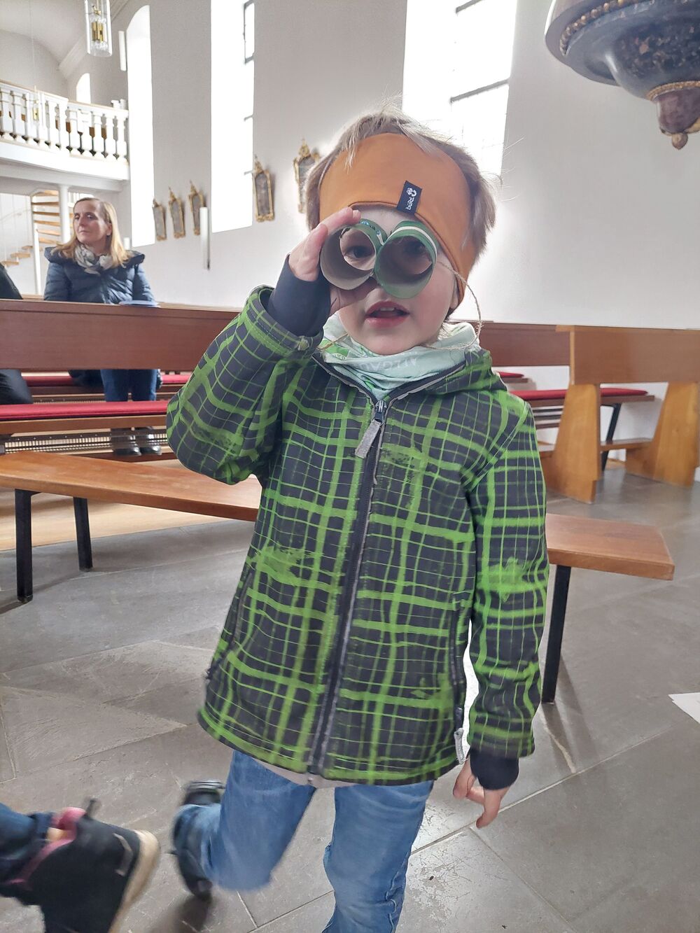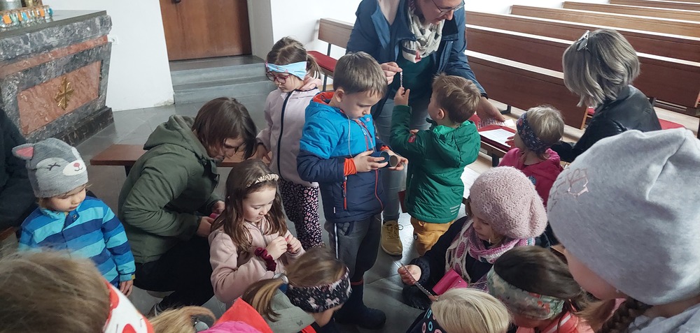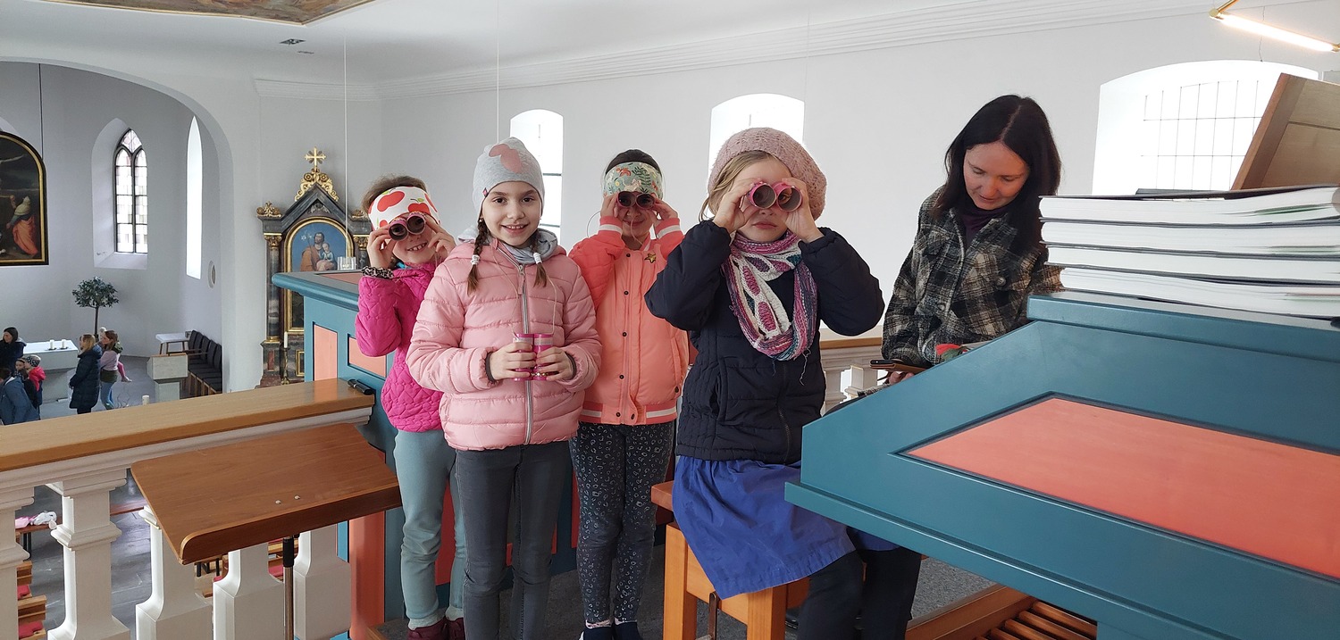 Ein Blick durch das selbstgebastelte Fernrohr und dann ging es los auf Entdeckungstour durch die Kirche. In Gruppen besuchten die Kinder die verschiedensten Stationen. Die Sakristei wurde von Dietmar Hirschbühl erklärt, Pfarrer Ratz ließ die Augen beim neuen Taufbecken, der Osterkerze sowie dem Altar strahlen. Sandra stimmte mit den Kindern die Orgel an und mit Anna wurden bei den Opferkerzen Wünsche zu Gott gesendet und den Beichtstuhl begutachtet.  Zum Abschluss durften die Erstkommunionskinder noch den Kirchturm erklimmen.
