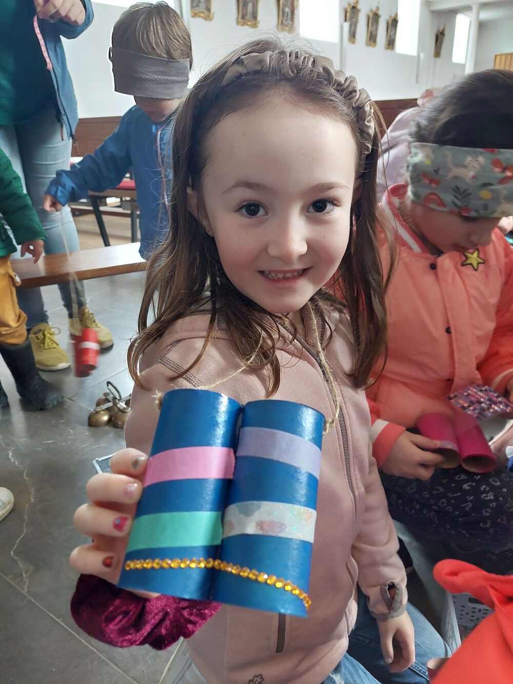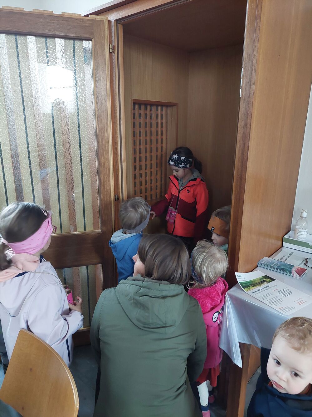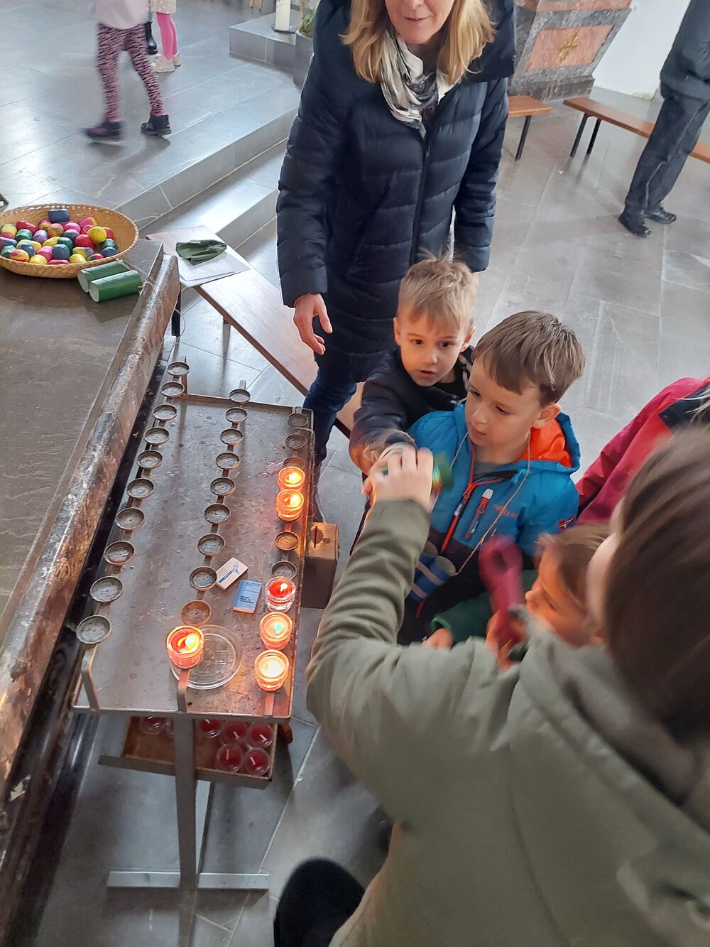 Ein Blick durch das selbstgebastelte Fernrohr und dann ging es los auf Entdeckungstour durch die Kirche. In Gruppen besuchten die Kinder die verschiedensten Stationen. Die Sakristei wurde von Dietmar Hirschbühl erklärt, Pfarrer Ratz ließ die Augen beim neuen Taufbecken, der Osterkerze sowie dem Altar strahlen. Sandra stimmte mit den Kindern die Orgel an und mit Anna wurden bei den Opferkerzen Wünsche zu Gott gesendet und den Beichtstuhl begutachtet.  Zum Abschluss durften die Erstkommunionskinder noch den Kirchturm erklimmen.