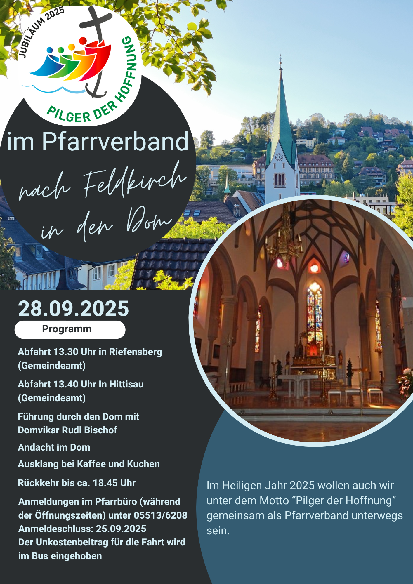 Abfahrt mit dem Bus ist um 13:00 Uhr in Hittisau. Vor Ort erwarten uns eine Führung durch den Dom, eine gemeinsame Andacht sowie ein gemütlicher „Einkehrschwung“.